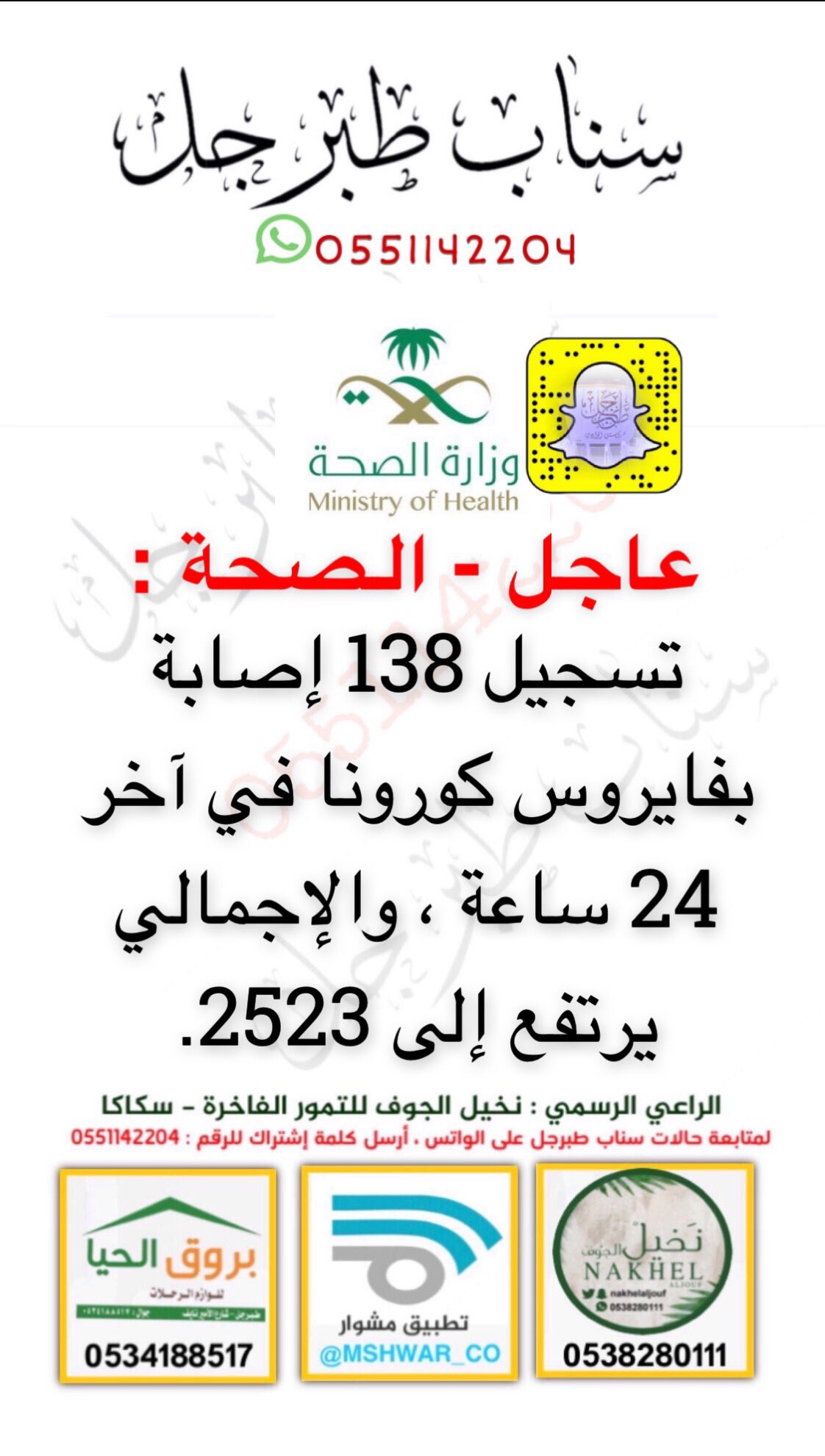 سناب طبرجل pa twitter عاجل الصحة تسجيل 138 إصابة جديدة بفايروس كورونا تعافي 63 حالة جديدة تسجيل 4 وفيات جديدة بكورونا إجمالي عدد الاصابات بفايروس