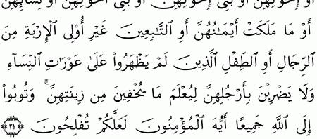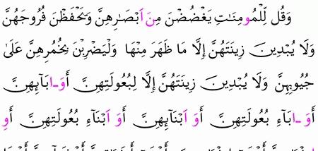 وقل للمؤمنات يغضضن من أبصارهن ويحفظن فروجهن ولا يبدين زينتهن إلا ما النور 31